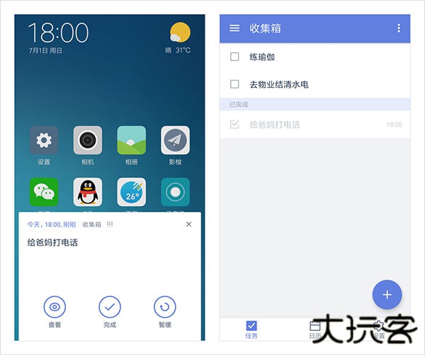 3、完成任务,提醒响起后就可以着手去做这个任务,任务完成后,点击弹窗下方的「完成」图标即可将任务打勾。或者在应用里点击任务左侧的小方框