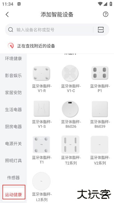 3.再返回TCL体脂秤app,进入主页找到设备或添加设备的选项点击,再左边的导航栏中选择运动健康选项,进入选择体脂秤型号