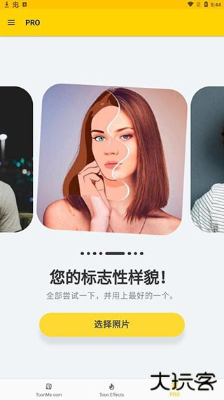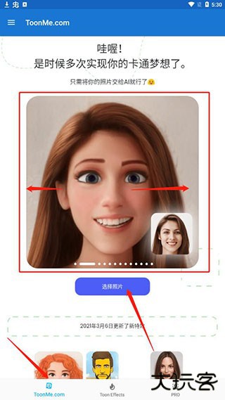 1、成功下载安装之后打开应用,在ToonMe.com中可以左右滑动选择一个喜欢的ToonMe特效,然后选择照片;