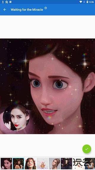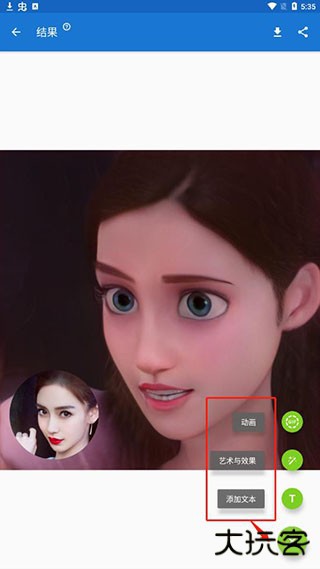 5、最后就可以看到你所选择的卡通效果结果,点击右下角的“+”还可以添加动画和艺术与效果以及添加文本;