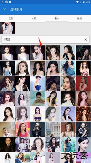 2、可以在全部中选择照片,也可以在自动识取的人脸中选择照片,还可以选择名人,比如明星;