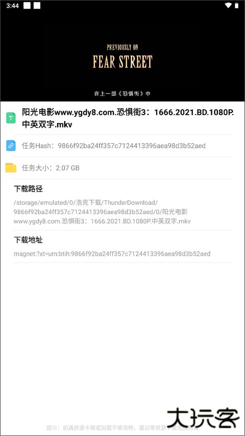 1、打开浩克下载器app之后会有一个磁力链接供你测试,点击右下角的尝试下载。