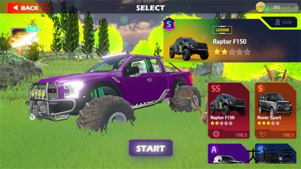 3、选好地图后就可以选择驾驶的越野车,想要获得新的越野车可以消耗硬币进行购买,硬币可以通过参加比赛来获得。