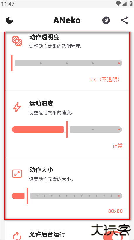 5、往下翻,根据自己的喜好来设置动作透明度、运动速度、动作大小。