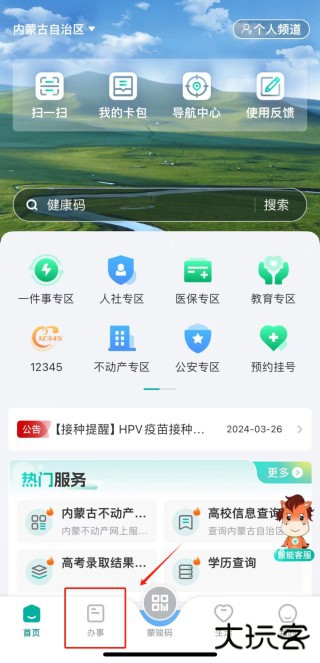 1、打开蒙速办,进入首页,找到并进入【人社专区】。