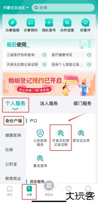 2、在“个人服务-身份户籍” 板块中,找到 “开具无犯罪记录证明”,点击进入。