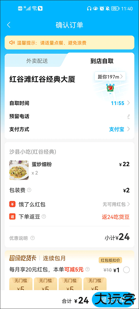 3、进入商户点好餐进入结算界面后,找到页面顶部的”到店自取“一项,点击进入。