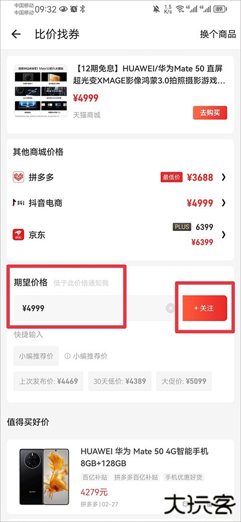 1、在比价找券页面中查找到各平台的价格后,然后在期望价格功能内输入你期望的价格,并点击右边的关注