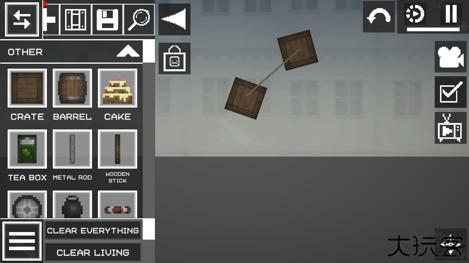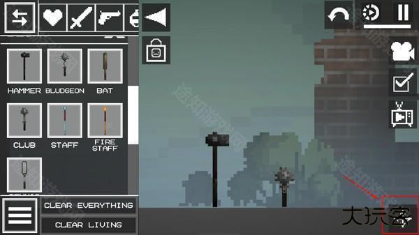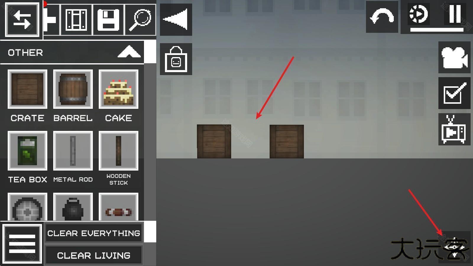 2、进入游戏如图,点击左上角菜单按钮,添加两个物品在地上;