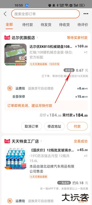 付款之后,我们就可以等待收货了,可以看到货物提示确认收货后16天到账返利金额。