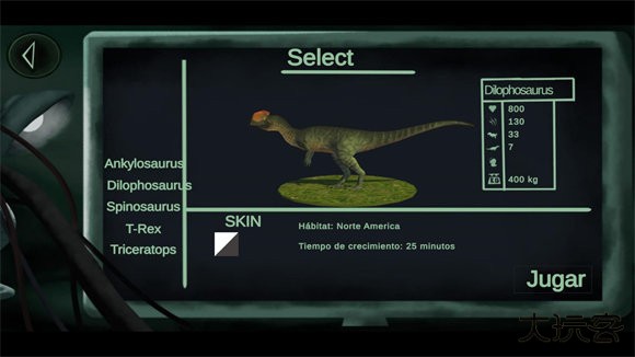 2、进入角色选择界面后,系统提供五种可操控的恐龙物种,根据偏好点击对应图标进行选择。