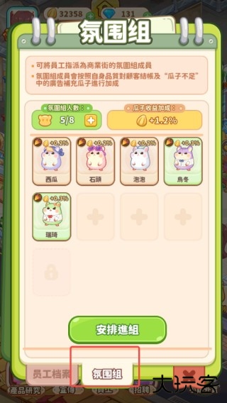 6、选择【气氛组】功能,可将当前空闲员工分配至该组,以有效提升店铺收益加成。