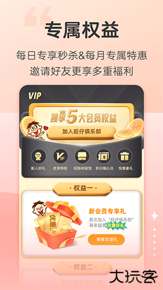 旺仔俱乐部是由旺仔官方推出的一款零食商城,这里提供最丰富的正品旺仔零食,涵盖抱枕、钥匙圈、御守、马克杯等,而且还会有非常多的活动,新品上架也会及时知道,你可以在这里买到旺仔所有的零食