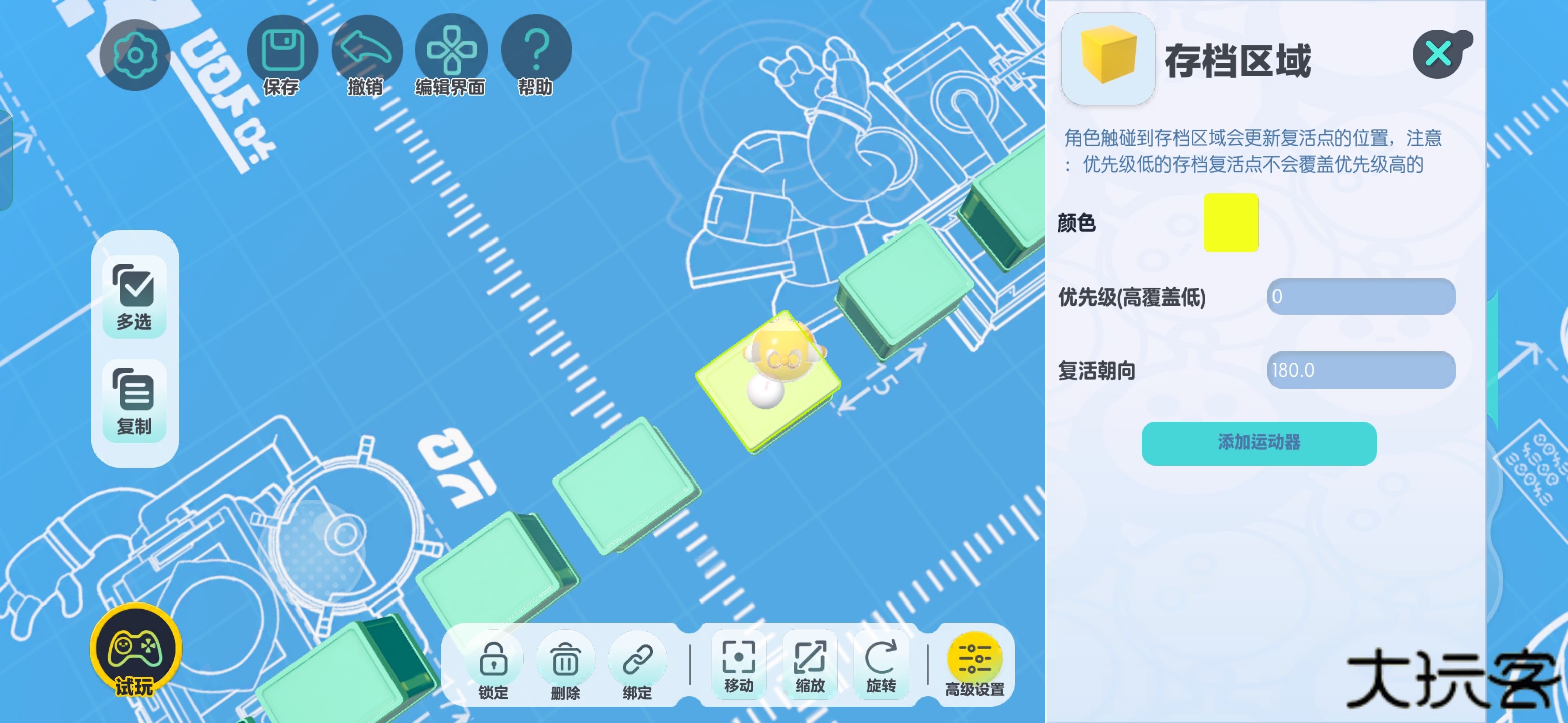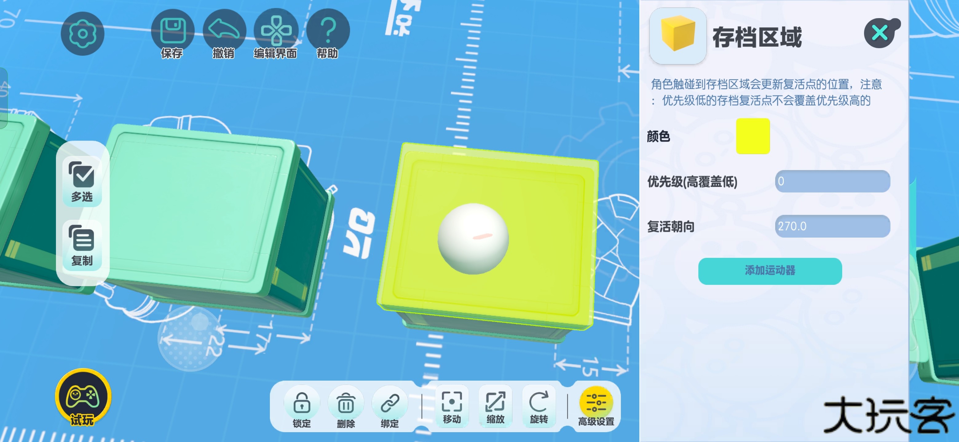 复活点的主体不是黄色方块区域,而是上面的白球,黄色方块只是触发点,复活只会复活到白球所在的位置(和传送门原理一样)所以很多作者就会用【复位】按钮来实现【自定义传送门】的功能