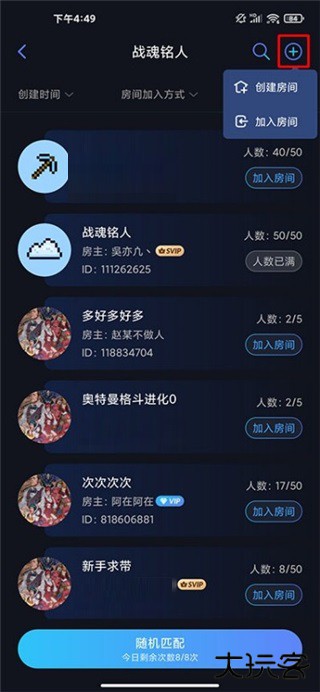 进入游戏房间列表后可直接选择房间加入或点击右上角“+”,自己创建房间