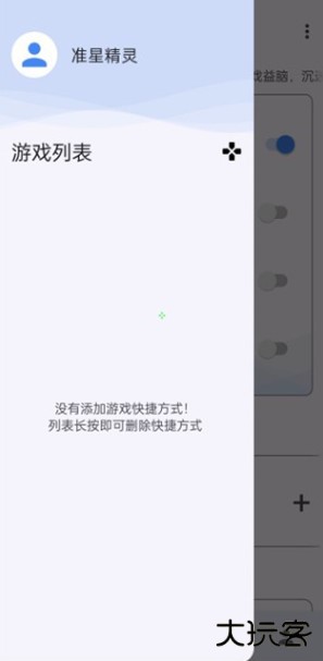 3、再点击主页左上角的『≡』符号,打开侧滑,然后点击侧滑工具栏右侧的加号,添加你最喜欢的游戏,添加到游戏快捷启动方式列表。其次可以添加第二个、第三个、第四个等游戏。然后返回主页面,打开准星,然后打开侧滑,点击游戏即可开始游戏。