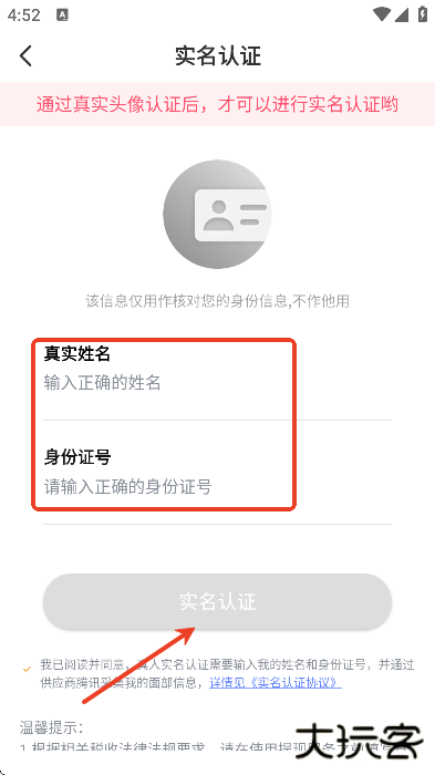 4、输入真实姓名以及身份证号后点击实名认证即可