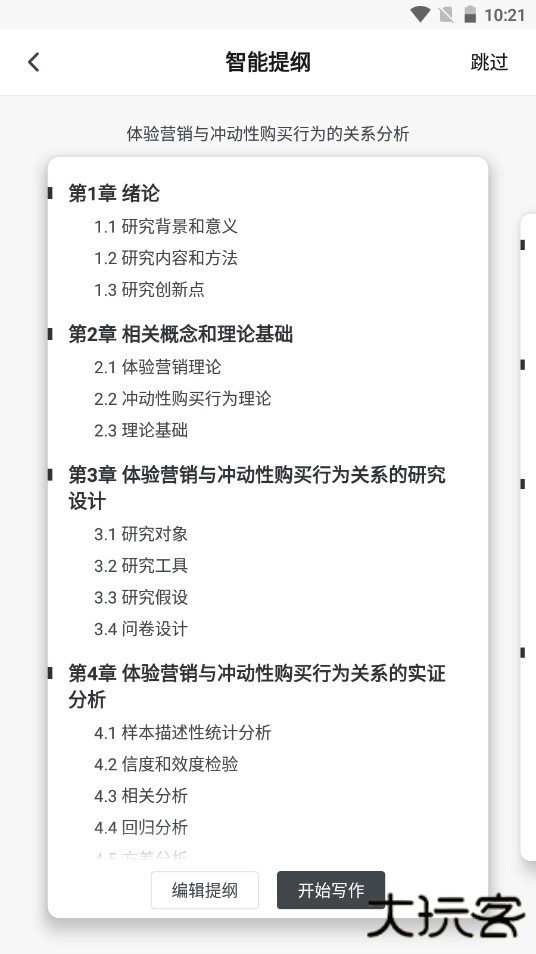 2、然后软件就会为用户生成提纲;如果点击右上方的【跳过】将不享受智能提纲推荐;