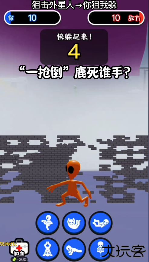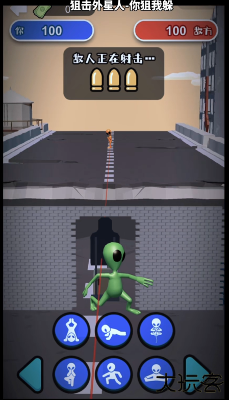 抖音最火爆的狙击外星人,你狙我躲,一元之争对局游戏。游戏玩法充满竞争性,玩家需要通过双方狙击对局来完成每一次的比赛,狙击方每个回合只有三颗子弹,如果命中爆头就会结束游戏,如果打中身体那么结束回合,继续游戏。外星人有很多的动作可以躲避子弹,依靠墙壁来掩藏自己身位,保护好自己的脑袋,别给一爆头了。