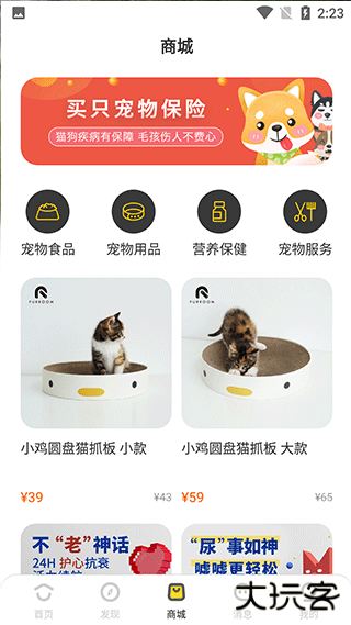 3、点开商城,在商城中你可以购买到宠物的食品、用品、保健品等,还配备了宠物服务;