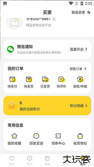 4、点击我的,在这里可以查询自己购物订单。