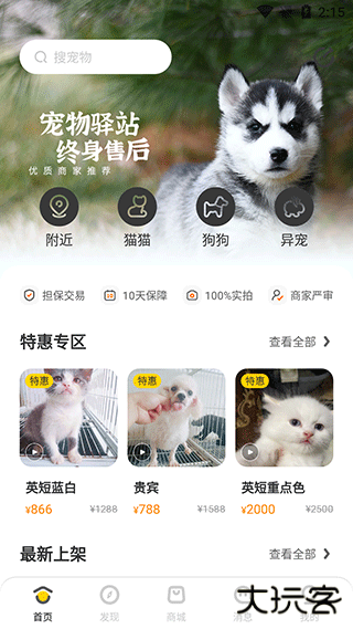 1、下载安装并打开软件,在软件首页可以看到宠物的特惠专区、最新上架、优质宠物精选;
