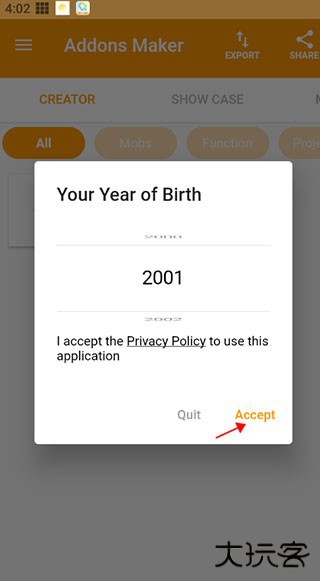 1、打开我的世界mod制作器app,选择生日然后点击右下角的accept(接受)
