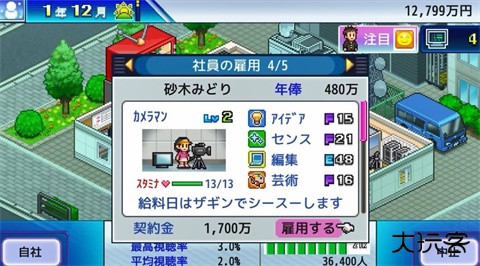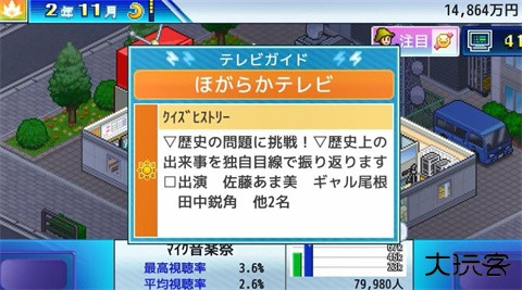 电视演播室物语是一款开罗系列的模拟经营游戏。玩家建立新存档,还有很多的主持人和演员来为你演播角色。更多的电视机剧情开始全新体验。提升演播室的等级,吸引更多的观众来观看你的节目。节目种类有很多,开始任务吧。