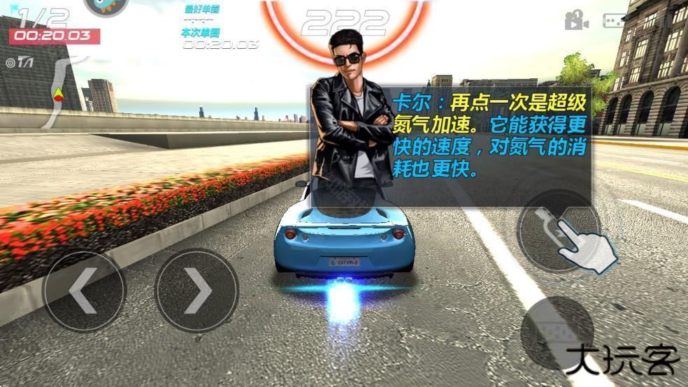 1、打开游戏以后首先进入玩法教程,点击右边的按钮控制车辆方向