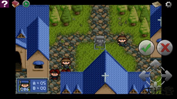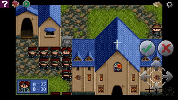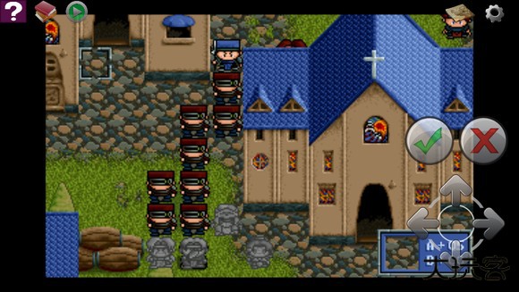 战斗开始,亚雷斯一个人沿中间房子右侧直接冲上,在第三回合顶在顶部三岔路口下面一格。