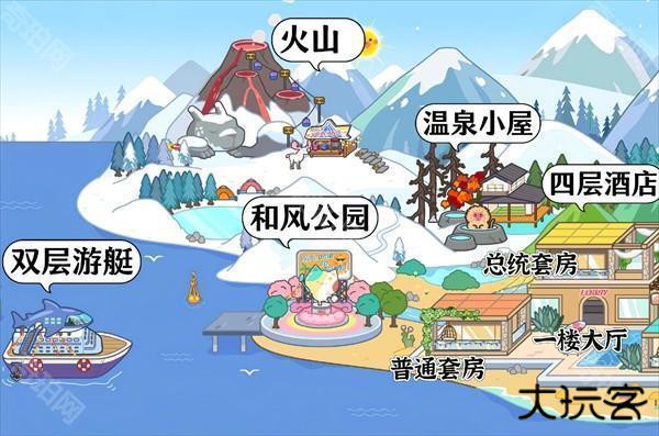 17、火山、双层游艇、和风公园、温泉小屋、四层酒店。
