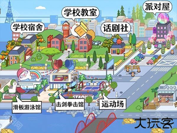 11、学校宿舍、学校教室、派对屋、话剧社、滑板游泳馆、击剑拳击馆、运动场。