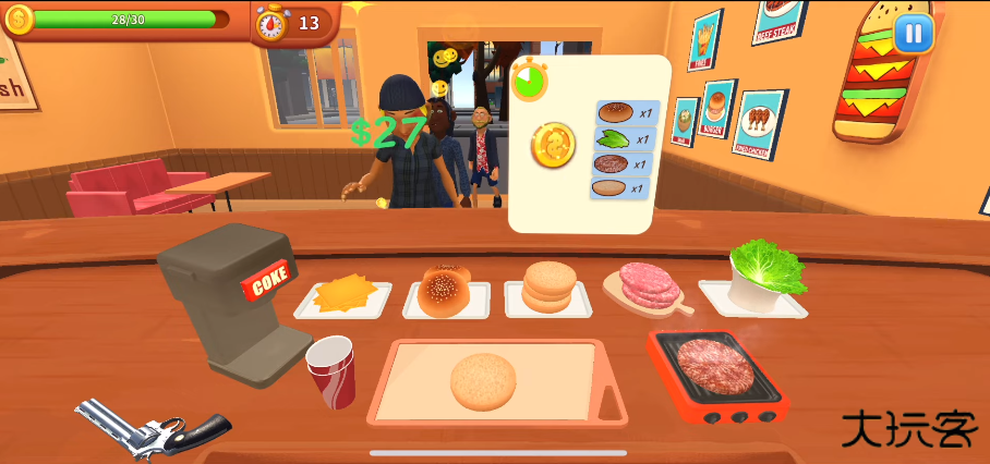 3.随着游戏进程,节奏与难度逐步升级。你需要在有限时间内高效处理多个订单,在忙碌的用餐高峰中保持冷静,确保每道菜准时上桌。