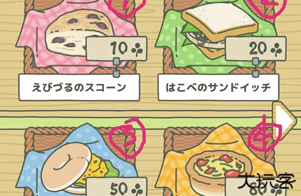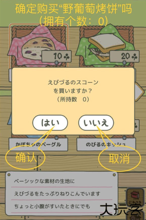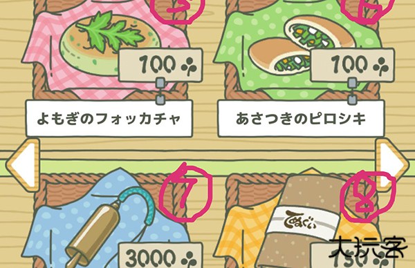 5、【购买便当】用收割获得的18枚三叶草去商店买便当时,点击“野葡萄烤饼”,此时出现红框圈定,再点击一次就会出现购买确认窗口了。