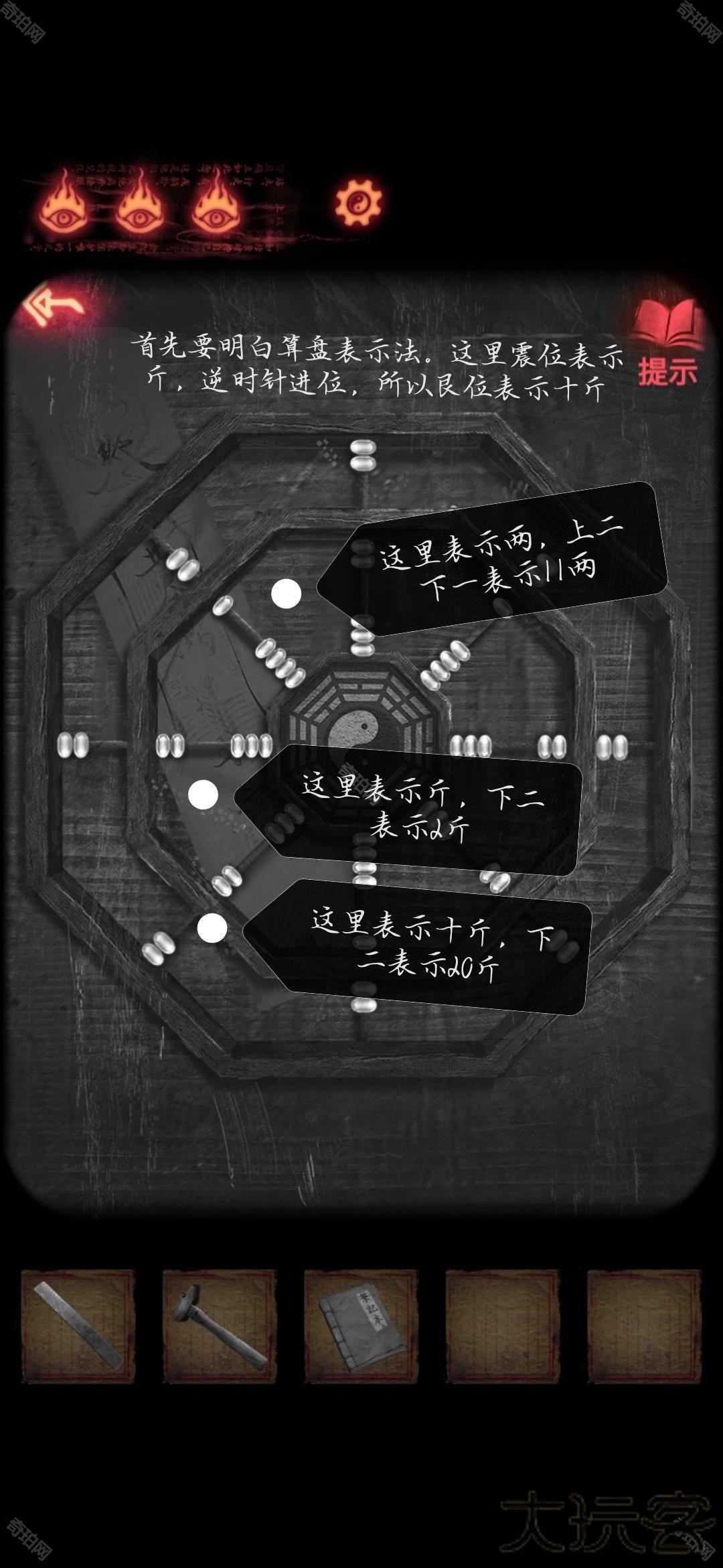 把所有内容相加是21斤27两,1斤相当于16两,所以结果是22斤11两。巽位表示两就是大概11点钟方向表示两,外面两个珠子每一个表示5,里面表示1,所以需要两个上面的珠子和一个下面的珠子贴近横梁。同理,震位就是9点钟方向表示斤,这里的斤只能表示个位(和算盘一个道理)同时因为是逆时针进位,所以艮位也就是8点钟方向表示斤的十位,所以22斤需要艮位两个内侧珠子贴近横梁,震位两个内侧珠子贴近横梁。