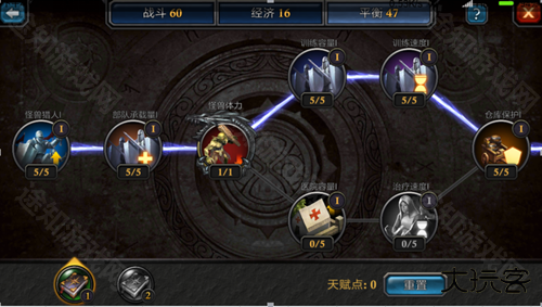平衡天赋的加点,平衡天赋在发展过程中起着很大作用,因为它在发育时对各个建筑的属性加成包括医院容量、训练速度和其他很多地方都有加速和提升。这个加点也建议全部往后面加。加点稍微复杂的就是战斗天赋的加成,另外一点大家记得注意使用天赋技能,比如使用立即生产立马从城里田中收取五小时采集量,使用三秒回兵坑打你的人这些都是很实用的技能。