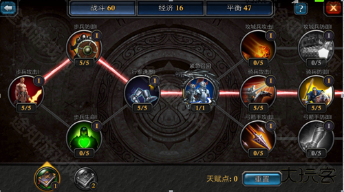 战斗天赋的加点,战斗一栏主要是对各个兵种及对整体伤害的属性加成,在这里面步兵防御和步兵生命是很重要的,步兵承受伤害,几乎对方所有攻击都要由步兵来抗,步兵不光,其他兵是不会死多少的,所以建议大家把所有加步兵生命、防御、伤害的全部加满。没有步兵栏的就加骑兵和弓箭手的防御和攻击,最重要的一点不要所有的都加着走,一般一路往下加就可以了,因为越到后面天赋点需要的越多,所有加着走肯定加不了多少,一般领主到45级以上的玩家建议一路加到生命保护术,因为开着生命保护术打人可以加30%的劫后余生。