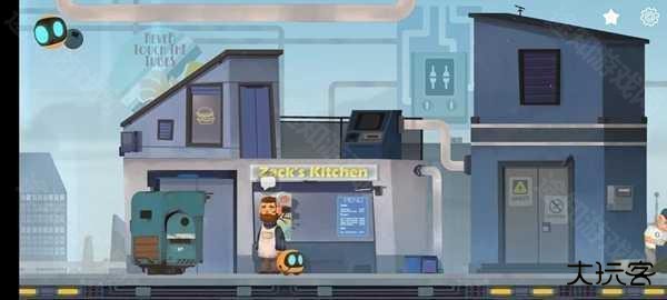 2.直走来到小镇上往前,得知绿色垃圾桶机器人想吃罐子,往前邮箱里的信也读一下,然后进入餐厅。