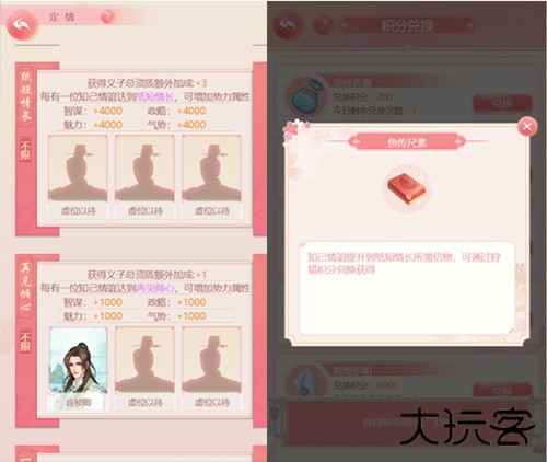每一位知己的初始阶段都为一面之识,小主可通过赠送知己道具,增加知己的属性总和以及亲密度,在皇家苑囿的积分兑换中,可使用积分兑换提升知己情谊的道具,当知己的属性总和以及亲密度达到要求,并拥有对应情谊所需要的道具,则可以提升知己的情谊哦。越高级的情谊所需要的属性总和以及亲密度越高,相应数量也越少,最高级情谊为一生挚爱,小主们加油哦~