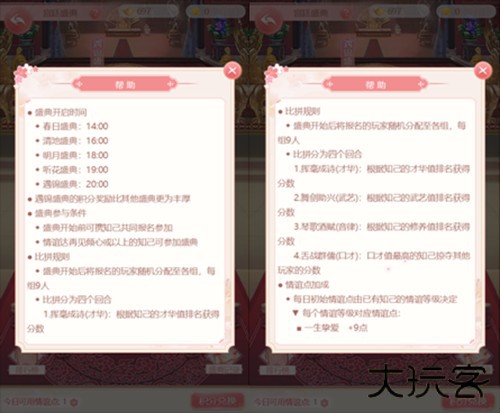 提升知己的情谊,可以提高小主的势力,同时也可以解锁乾清宫,参与宫廷盛典。每提升一位知己达到再见倾心,则可以多参加一场盛典,最高5场盛典,每场盛典开启时间都不同,小主可在盛典开始前,派遣知己参与,参与前可以分配情谊点,临时增加知己的属性。每场盛典比拼分为4个回合,分别比拼才华、武艺、音律、口才四项属性,其中才华、武艺、音律回合可获得分数,口才回合可以掠夺其他玩家分数!以最终分数作为排名依据,根据排名发放奖励。