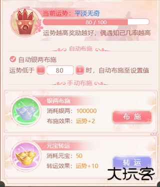 运势越高遇到知己几率越大,所以想要尽快的把知己都带走的话可以通过点击游玩左下角的【运势签】来提高当前的运势哦,布施可以使用银两+2点运势、另外还可以使用元宝转运使当前运势+10呢~此外在布施页面可以设置【自动布施】,勾选自动布施后会在每次游玩过后自动将运势补充至设定值。运势每15分钟恢复1点,且只能回复到90点。
