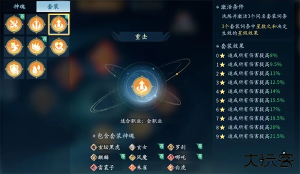 5、重击为增伤型通用神魂。效果为提升造成的所有伤害百分比。在仙侣战斗(侠侣系统)、玩家对抗及副本挑战中均有效能。其伤害增益效果在侠侣系统中尤为显著。作为攻击向通用神魂,包括玲珑在内的全职业均可装备,适用场景极为广泛,可作为优先级较高的兑换选项。