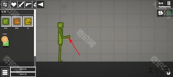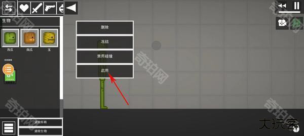 3、然后将胳膊抬起,双击西瓜角色胳膊会出现删除、冻结、静置碰撞、启用,选择冻结,胳膊就会停住;