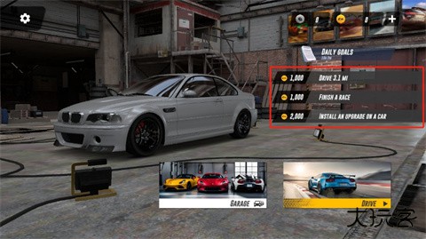 2、点击【GARAGE】也就是车库,这里有很多不同种类的汽车,当玩家有拥有足够的金币时,就可以进行购买。