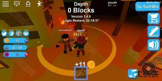 当背包装满后,我们直接点击右上角的传送就能直接回到地面了。这时候去找标有出售的铁匠,进入黄色的圈圈就能自动将背包里的矿石换成金币,然后就可以继续去快乐挖矿了!