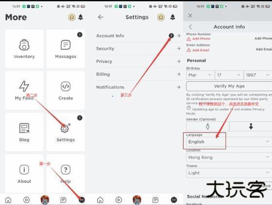 2.进游戏后如果还是显示英文,可以按照以下步骤进行修改,首先点击more-下面的三个点,然后选择设置settings,选择1-accountinfo