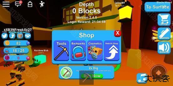 当拥有一定数量的金币后,我们可以去找标有购买标识的商人购物!进入黄色圈圈后,会弹出商店界面,共有四个分类,分别是工具、背包、装扮(可以购买一些发型、宠物等)和重生商店(可以购买一些道具)。前期主要是购买更高级的工具和背包,这样就不用频繁回到地面,提高挖矿(赚钱)的效率~拥有高级的道具后,我们就能逐渐深入更下层的地里挖矿,能挖到更好的东西,运气好的话能挖到金箱子、钻石等,但对应的,需要的挖矿工具级别会很高!