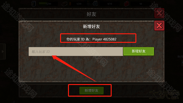 2、点击“新增好友”输入需要添加好友的id,相应的如果其他玩家想要添加你也可在此页面下获取到id