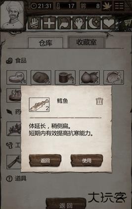 2、冬天怎么过:从31-61天都属于冬天,尤其在50-55天左右温度非常低,最好在探索完前期的几个资源点以后,就开始累积资源。将火堆和帐篷升满级,准备大量的草药,淡水和木头就能过,如果有抗寒的鱼或者藤甲就更轻松了。