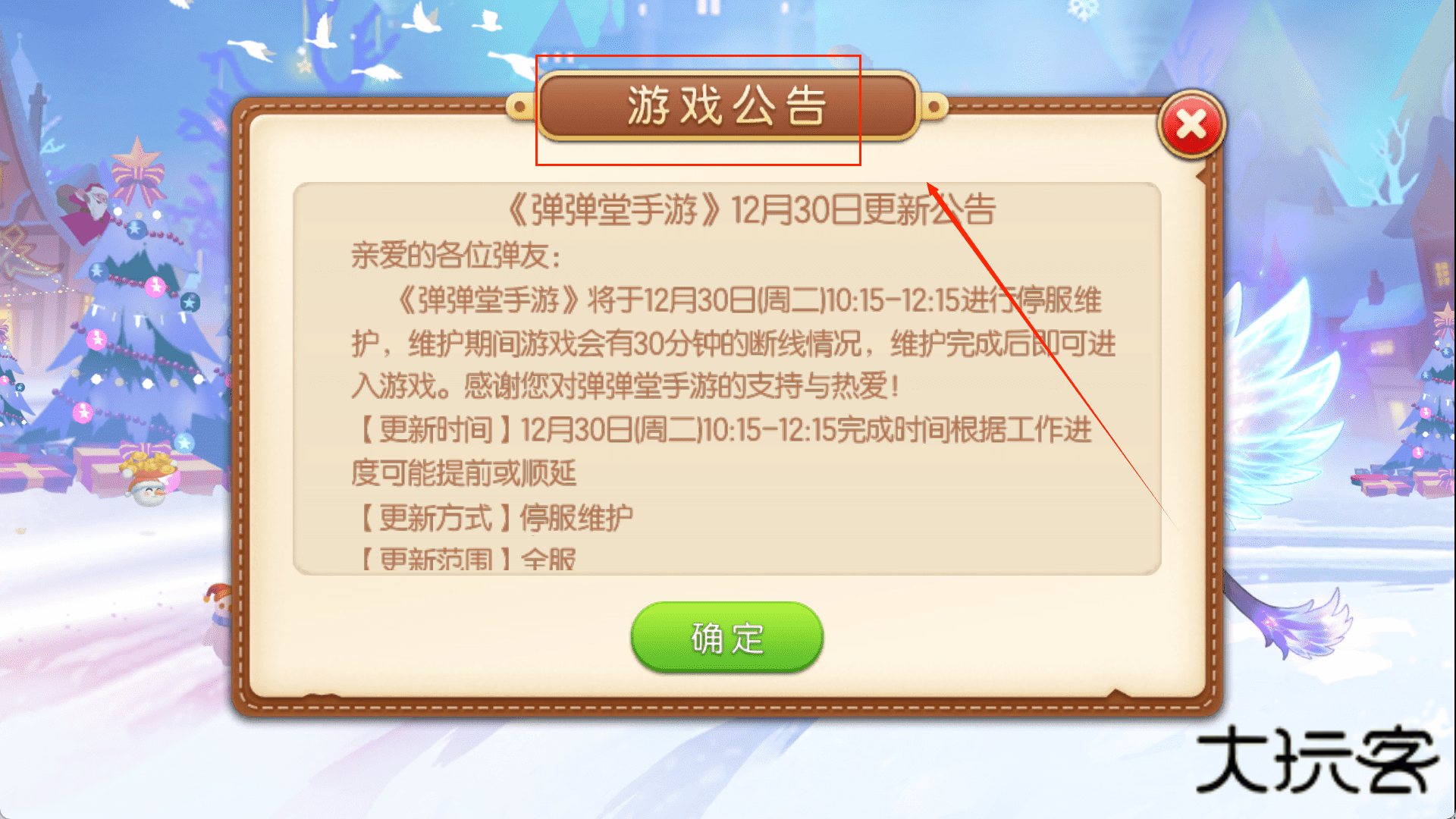 1、游戏一开始,你会先看到隐私保护指引的提示,背景是城堡和圣诞树。你需要做的操作很简单,就是仔细阅读上面的文字,然后在提示框底部点击那个显眼的绿色“同意”按钮。